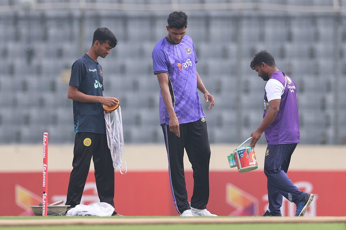 প্রথম আলোর প্রতিবেদক মাহমুদুল হাসান জানিয়েছেন, মাঠ শুকানোর কাজ চলছে। দুটি সুপার সপার ঘুরছে মাঠে। মাঠকর্মীরাও তাদের মতো চেষ্টা করছেন। বন্ধ হয়ে যাওয়া ফ্লাডলাইটগুলোও জ্বালানো হচ্ছে ধীরে ধীরে।