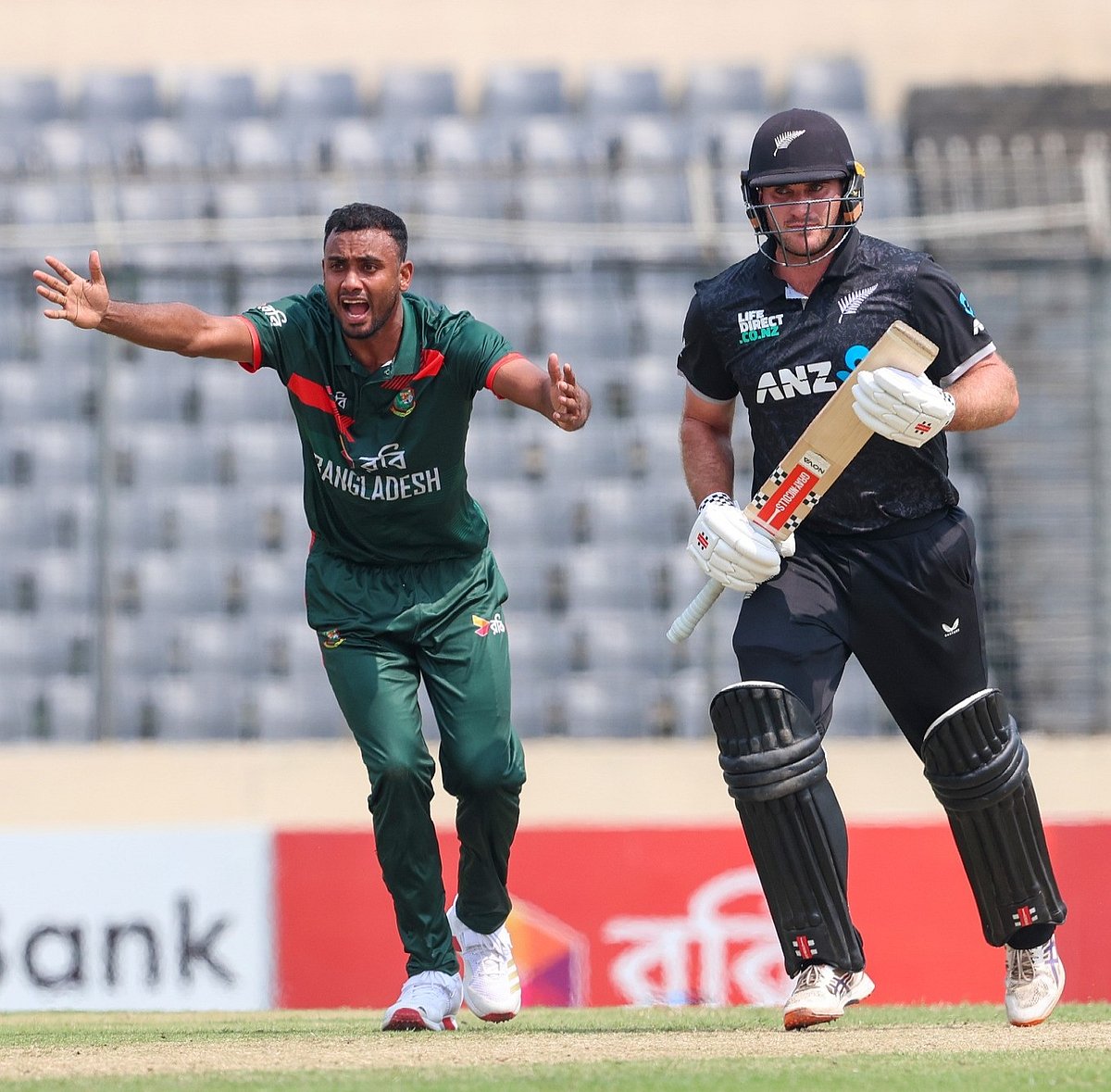 নিকোলস ও ইয়াং দৌড়ে ১ রান চুরি করার সময় স্ট্রাইক প্রান্ত থেকে নন স্ট্রাইক প্রান্তের স্টাম্পে থ্রো করেন বোলার নাহিদ রানা। মিড অনে দাঁড়ানো তানজিদের পায়ের তলা দিয়ে বল সীমানায়—মোট ৫ রান! ওভারের চতুর্থ বলে এমন ফিল্ডিং মিস!